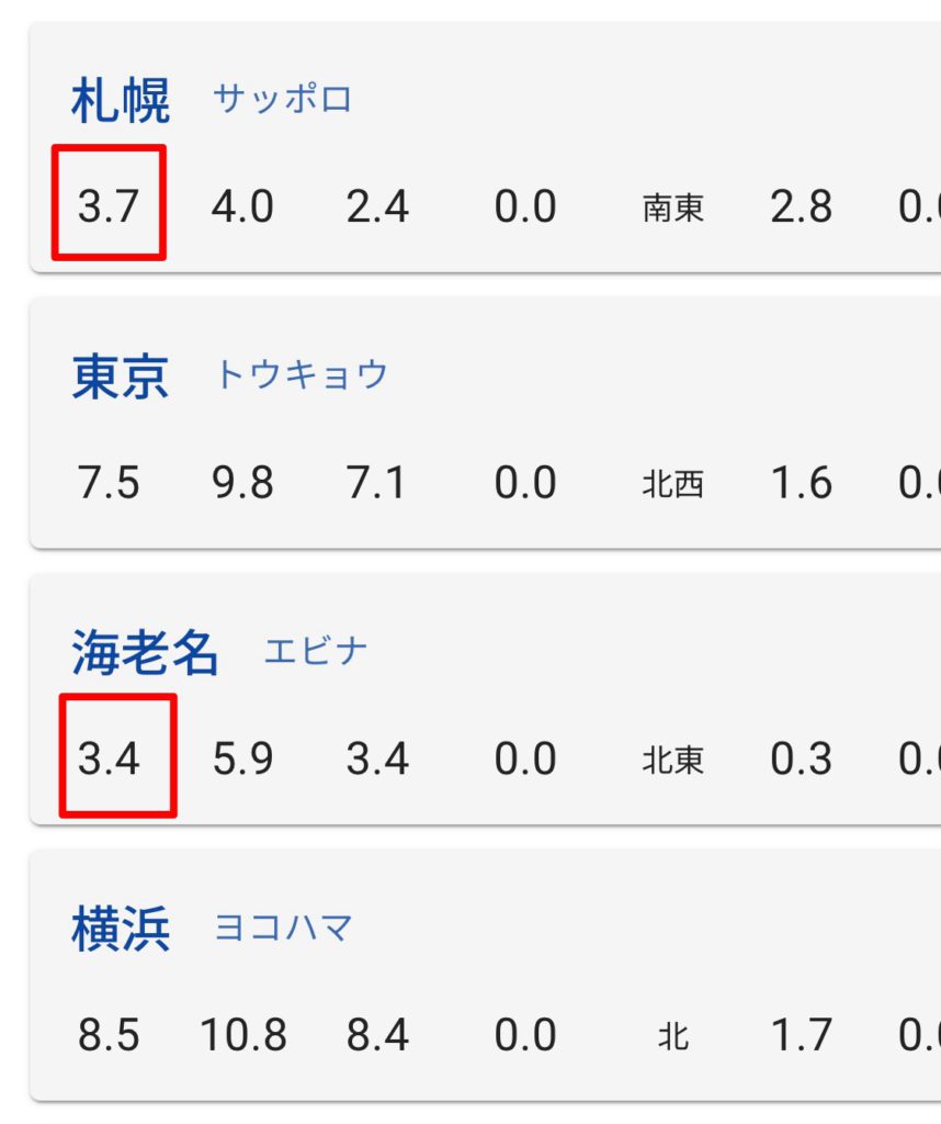 札幌3.7℃ 海老名3.4℃